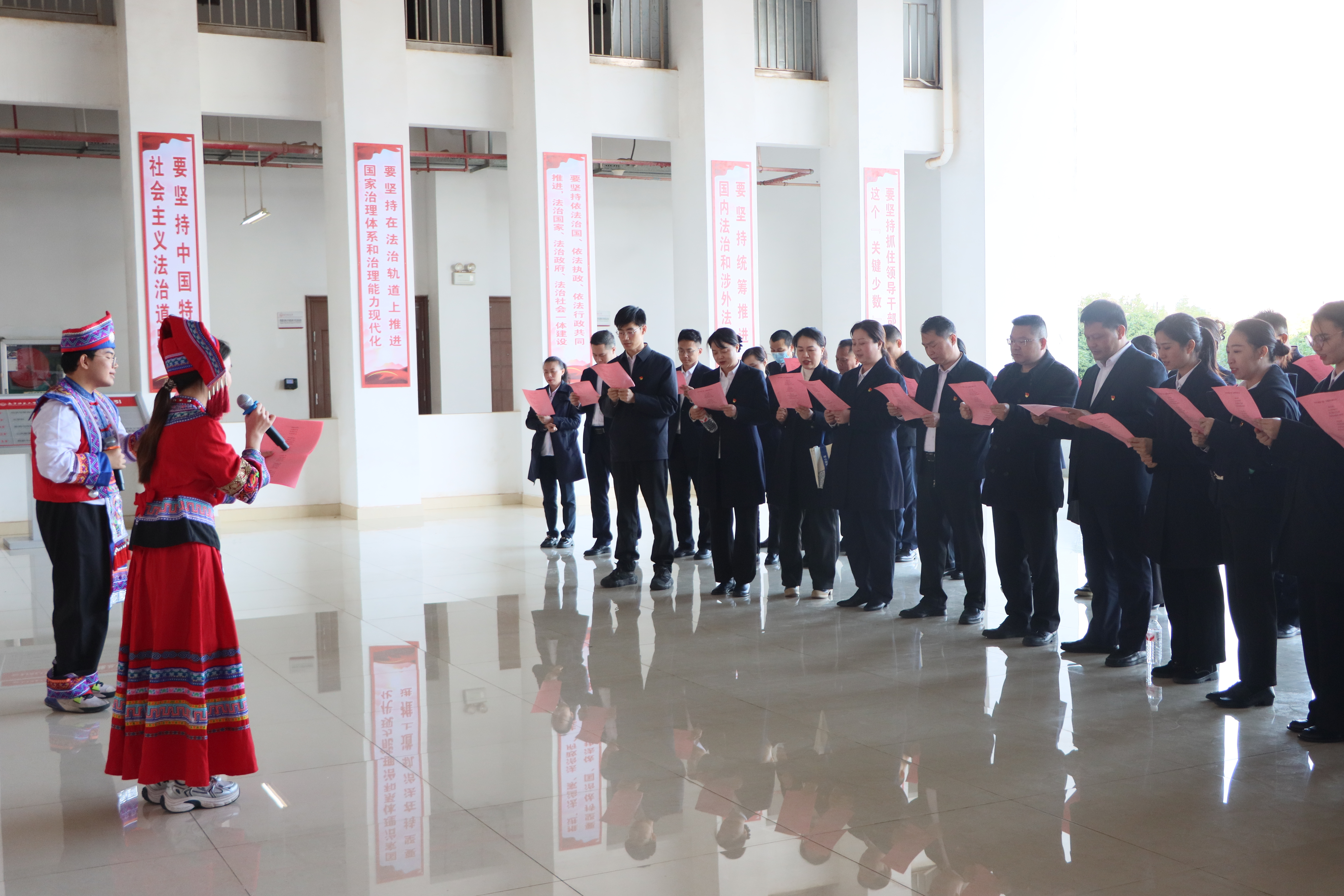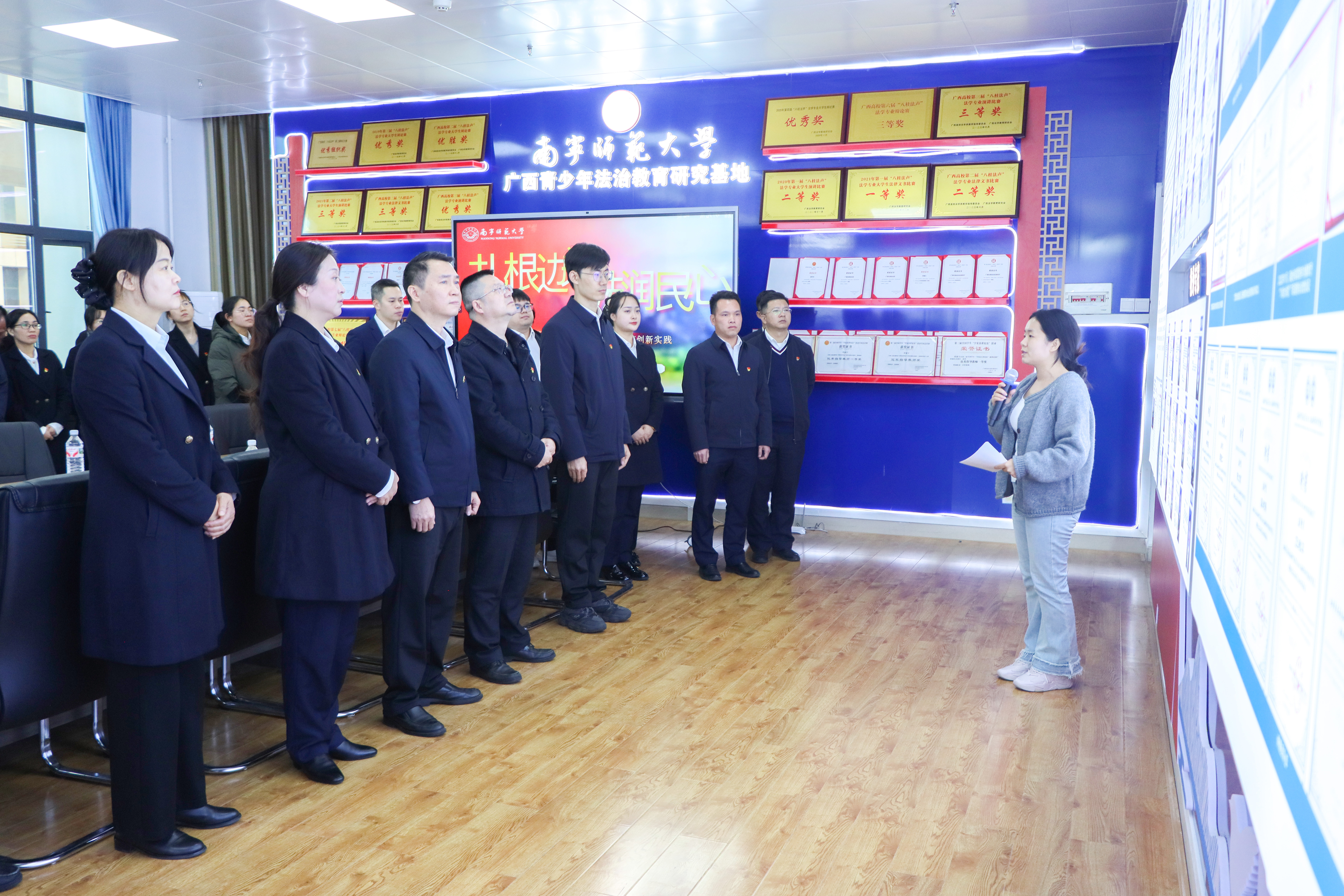 活动开始,全体人员有序参观了法治教育研究基地,详细了解学院在法治学科建设、人才培养以及服务地方法治建设等方面取得的丰硕成果与鲜明特色。随后,金铜鼓普法协会学生通过创新采用“山歌普法”的形式,以生动活泼的演绎,让法治观念在旋律中深入人心,进一步提升了大家对法治实践的认识与体验。