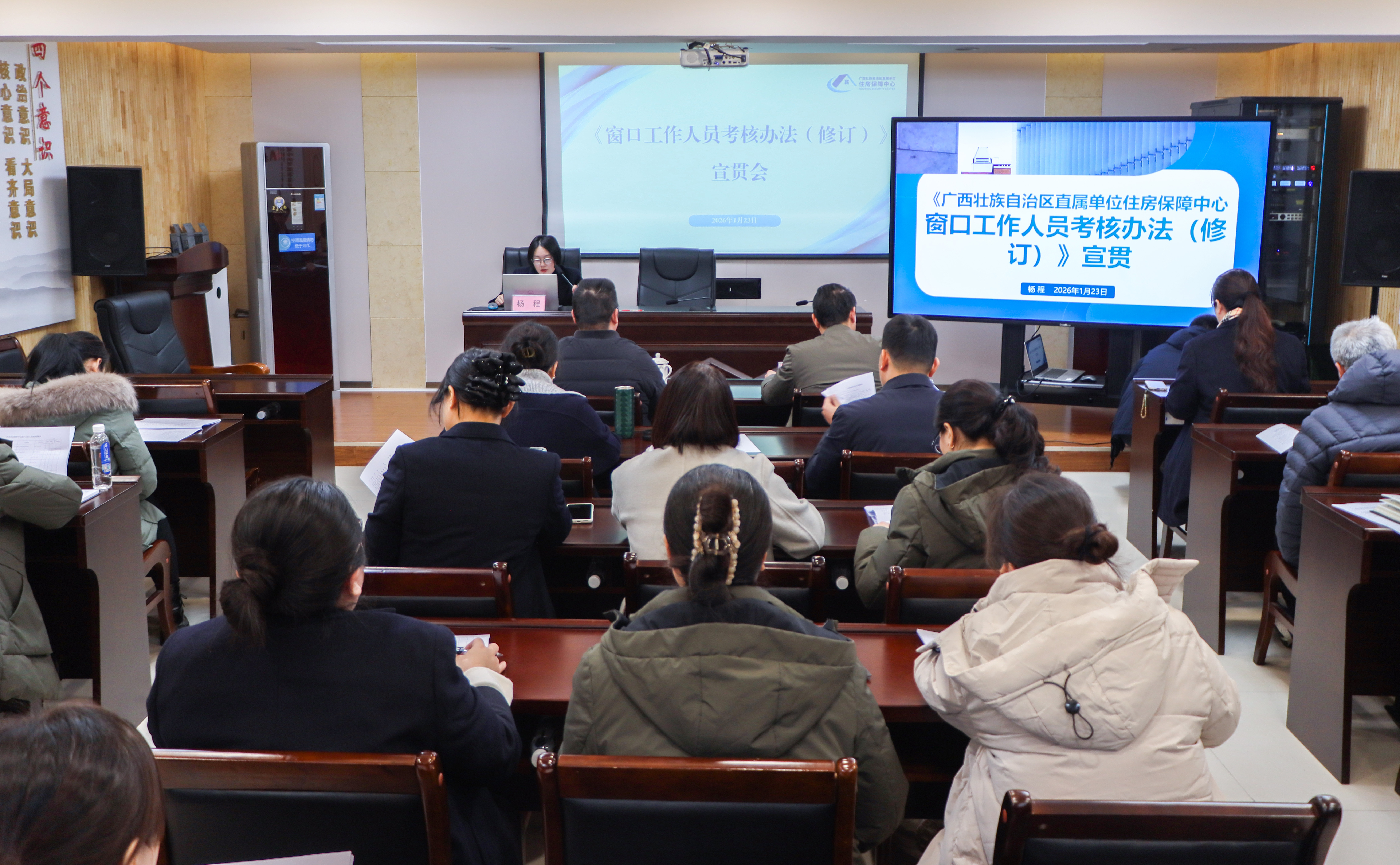 为推动新修订的《广西壮族自治区直属单位住房保障中心窗口工作人员考核办法(修订)》落实落地,进一步规范中心窗口服务管理,持续提升政务服务质效,区直住房保障中心于2026年1月23日下午召开专题宣贯会,对新修订的考核办法进行全面解读和部署落实。中心主任丘赤宇出席会议并讲话。