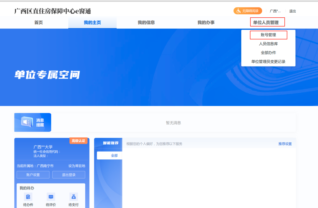 第二步:进入单位专属空间后点击单位人员管理中的账号管理