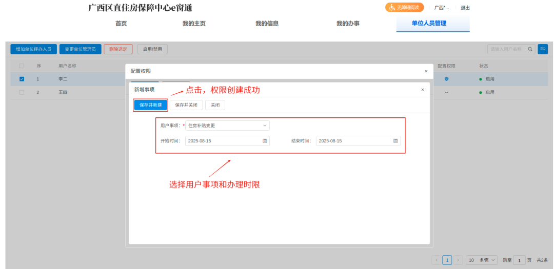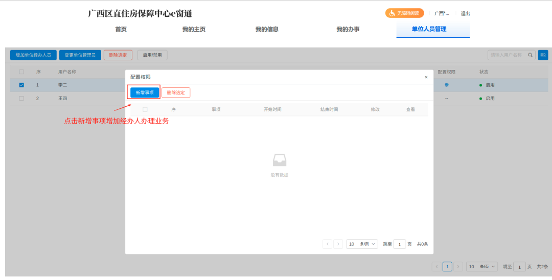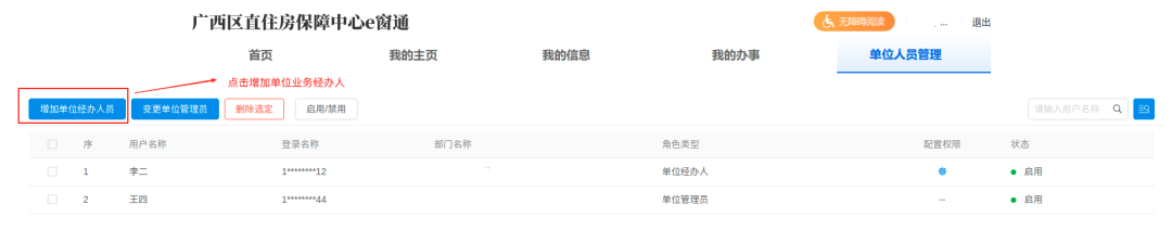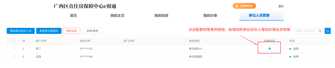 第五步:管理员点击配置权限里的按钮,给新增单位业务经办人增加办理业务的权限。