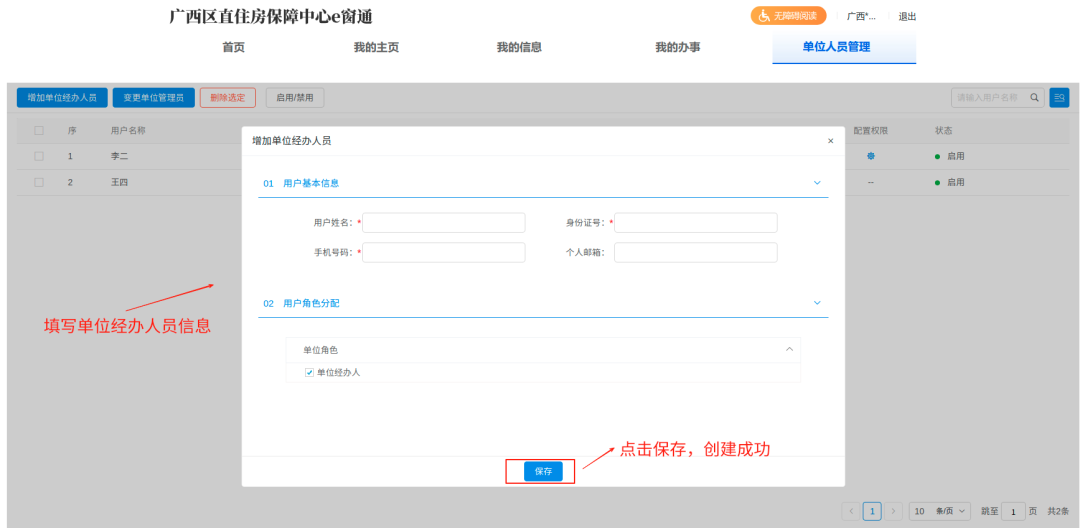 第四步:输入单位业务经办人信息,点击保存创建成功。单位管理员新增的其余单位人员使用账号(手机号码)和默认密码(Epoint@123)登录系统后可进行办理业务。