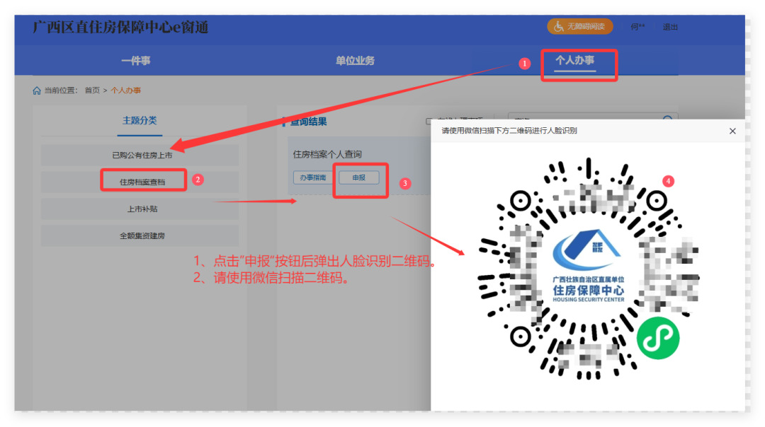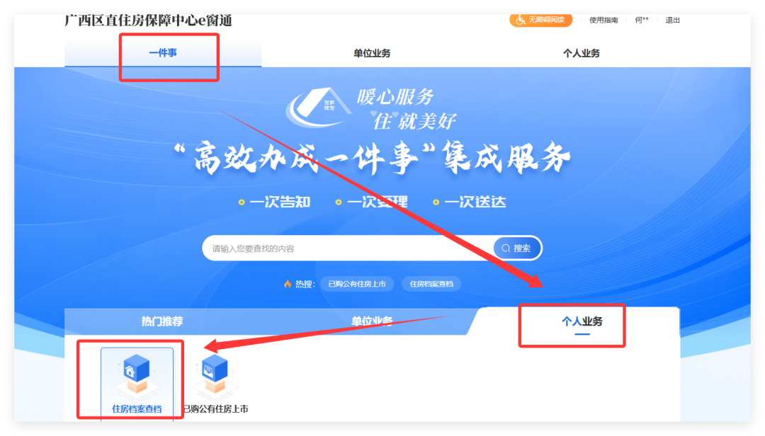 登录广西区直住房保障中心e窗通 “高效办成一件事”集成服务专区,完成个人账号注册登录后点击“热门推荐/个人业务”——“住房档案个人查询”,即可在线办理。