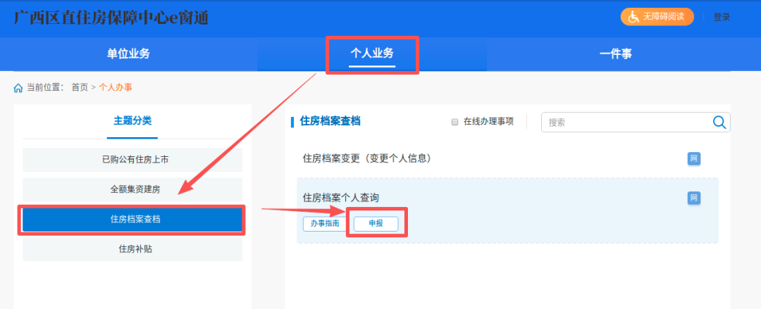 第二步:点击“个人业务”选择“住房档案查档”主题,找到——住房档案个人查档业务,点击“申报”按钮。