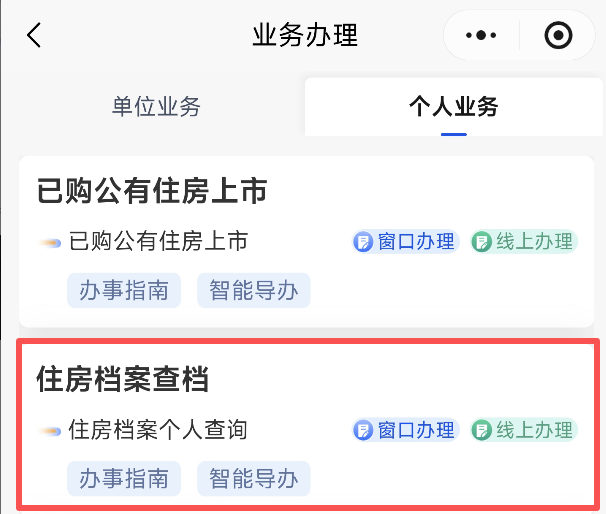 第一步:在一件事页面“热门推荐、个人业务”页面选择“个人业务”——“住房档案查档”主题,点击“智能导办”按钮,按照页面提示信息进行操作。