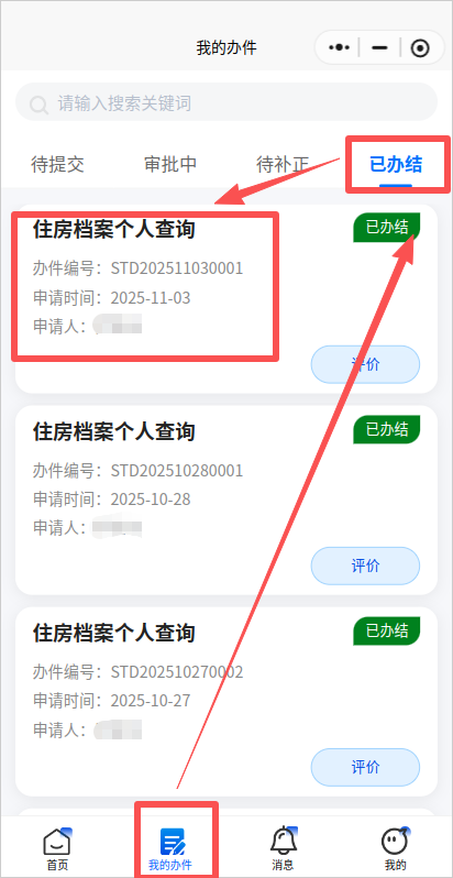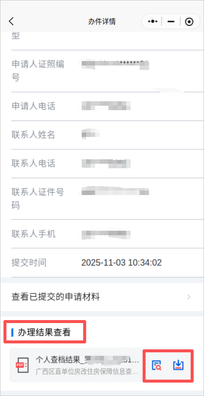 回到首页,点击我的办件——已办结,点击对应办件打开办件详情,下滑至“办理结果查看”可预览或下载办结结果。