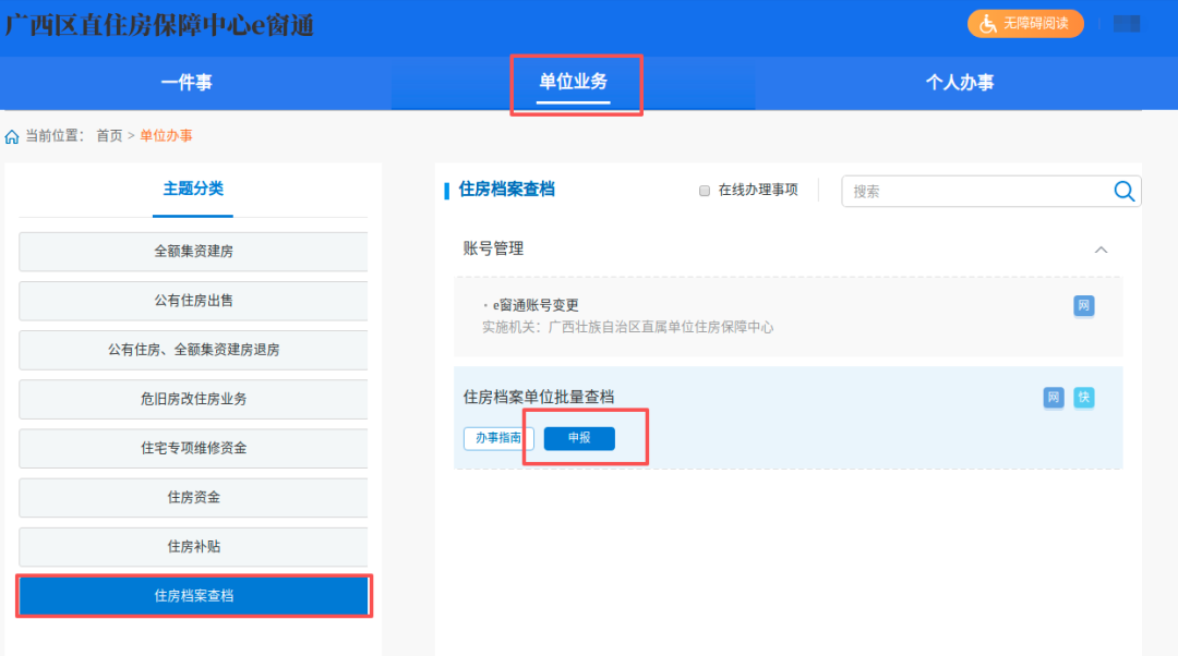 登录广西区直住房保障中心e窗通 “高效办成一件事”集成服务专区,完成单位账号注册登录后点击“热门推荐/单位业务”——“住房档案单位批量查档”——“智能导办”,即可在线办理。