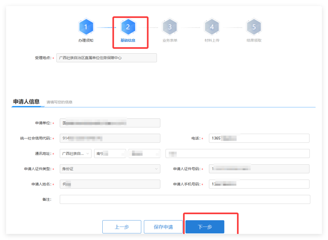 系统会自动抓取登录账号的基本信息,单位名称、单位统一社会信用代码,申请人姓名、身份证号码、手机号码等,请检查是否有误。补充完整的通讯地址后,点击“下一步”按钮进行业务表单填写。