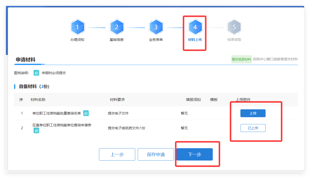 根据材料列表的要求上传材料,上传完成后点击“下一步”。
