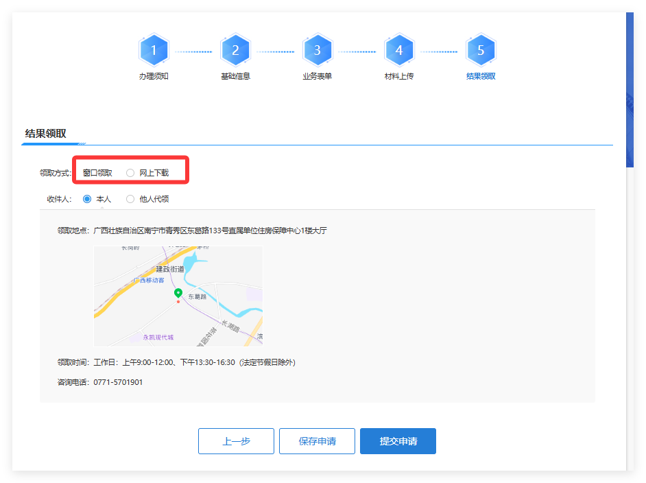 1.选择“窗口领取”则到线下大厅窗口领取办理结果。