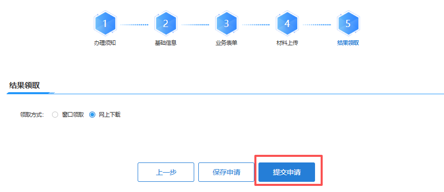 申办的业务如有纸质材料需要领取请选择领取方式(窗口领取/网上下载),选择完成后点击“提交申请”即可完成办件。