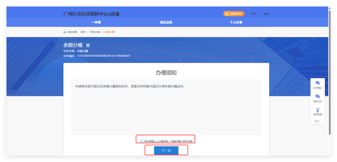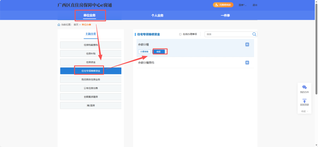 登录广西区直住房保障中心e窗通 “高效办成一件事”集成服务专区,完成单位用户账号注册登录后点击“热门推荐/单位业务”——“余额分幢业务”——“智能导办”,即可在线办理。