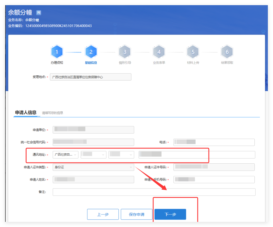 点击“申报”按钮后来到信息确认界面,系统会自动抓取登录账号的基本信息,单位名称、单位统一社会信用代码,申请人姓名、身份证号码、手机号码等信息,请检查是否有误。补充完整的通讯地址后,点击“下一步”按钮进行业务表单填写。
