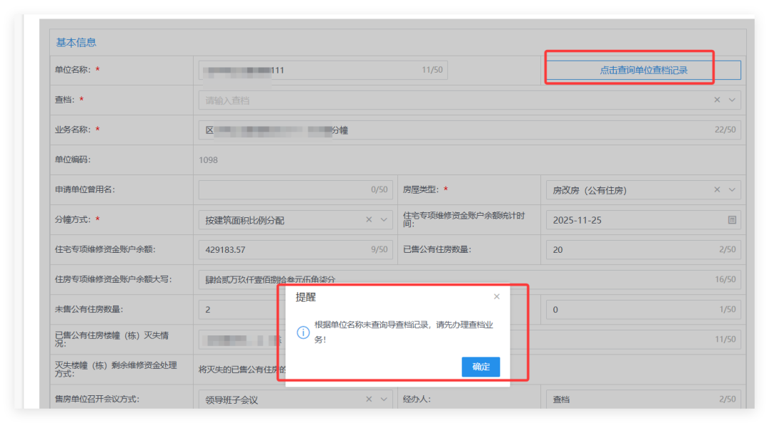 (1)根据实际情况填写表单,办理余额分幢业务需要已经完成余额分幢查档业务,点击“点击查询单位查档记录”按钮,如弹出图示意见,请先办理余额分幢查档。