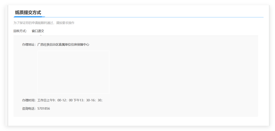 上一步中提及的纸质材料,仅支持窗口递交,请在办理时间内将纸质材料递交到区直住房保障中心,详细地址:南宁市青秀区东葛路133号(东葛路地铁站A1口旁)区直住房保障中心住宅专项维修资金业务窗口。
