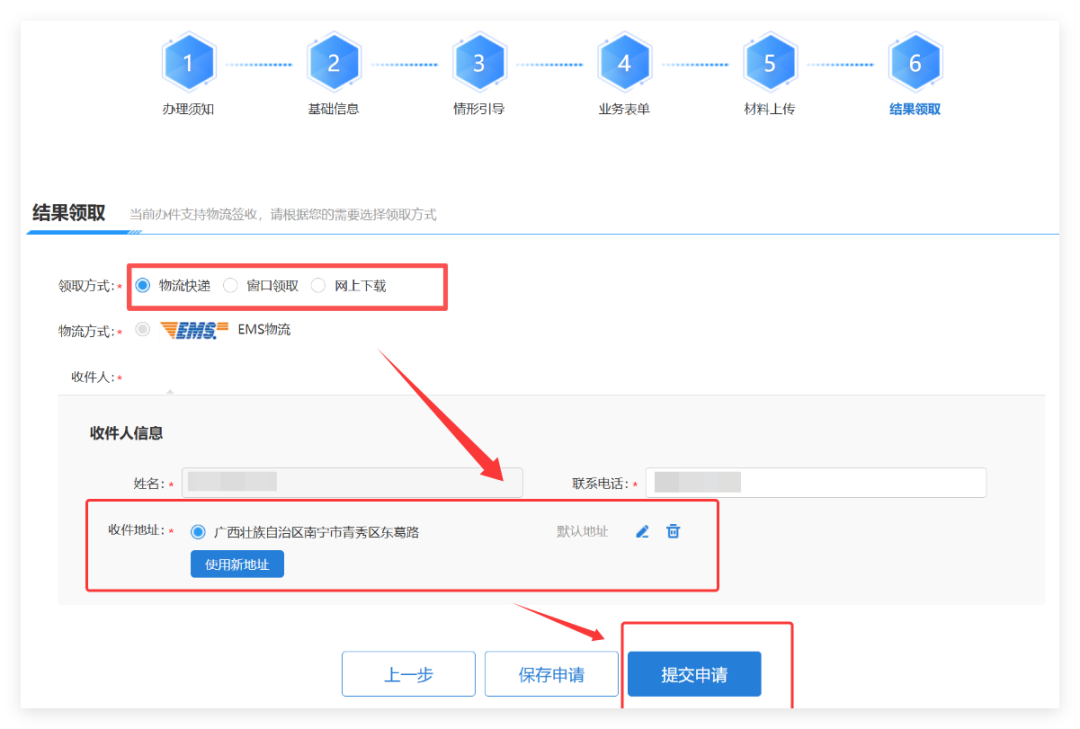 (1)选择“物流快递”则需要核对收件人信息,业务审核通过办结后,区直住房保障中心会通过EMS将结果文件邮寄到指定地址。