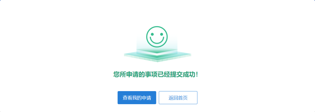 点击“提交申请”按钮后,业务申请完成。可在办结页面,点击“查看我的申请”快捷跳转我的办件页面,查看办件进度。