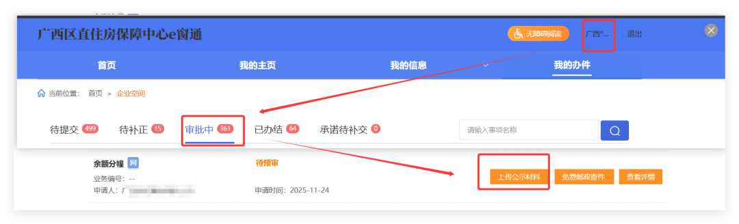 收到区直住房保障中心发送的短信后,请到【我的办件——审批中】,点击“上传公示材料”按钮,上传单位线下公示、并盖章的材料,具体如下: