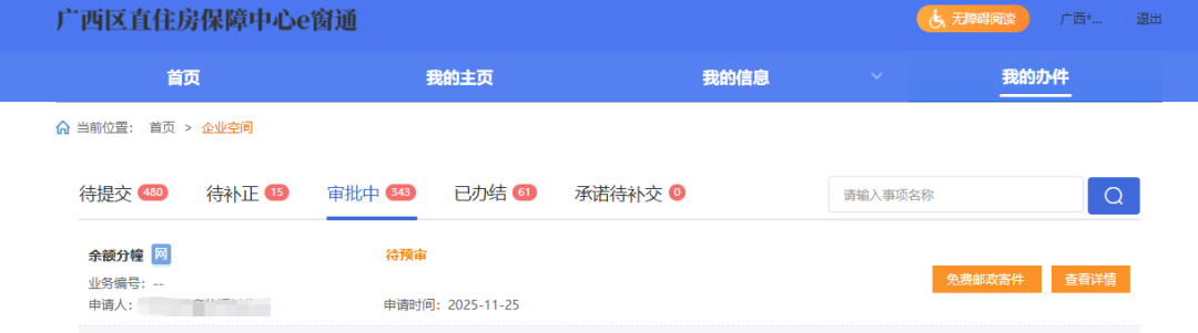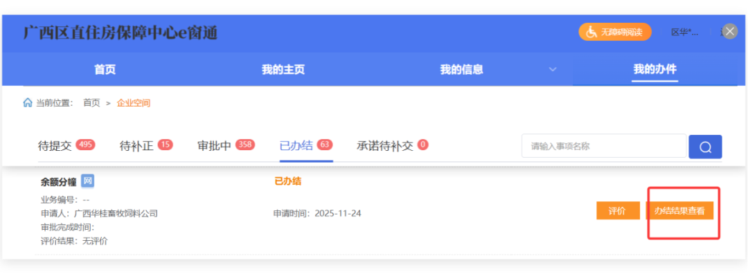 (2)首页——点击右上角的单位名称进入单位空间,再点击【我的办件】即可查看所有办件信息。
